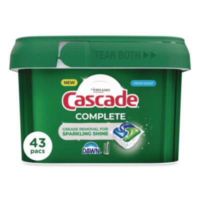 Cascade ActionPacs dishwasher detergent powers away greasy residue for sparkling dishes. That's because every ActionPac combines the scrubbing power of Cascade and the grease-fighting power of Dawn dishwashing liquid to leave your dishes virtually spotless. Cascade ActionPacs are conveniently premeasured with no finicky wrapping-simply load your dishwasher, pop in an ActionPac, and go! Complete® ActionPacs®-Needs no pre-wash. Application: Machine Dishwashing; Applicable Material: Ceramics; Enamel; Fiberglass; Glass; Metal; Plastic; Chemical Compound: Sodium Carbonate; Sodium Silicate; Enzymes; Phosphate Free; Dirt Types: Cooked-On Grease; Food Particles; Oils; Organic Matter; Soil.