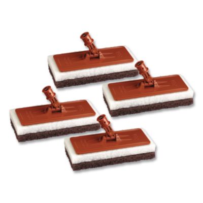 3M™ Doodlebug™ Pad Holder 6472 with Pads Kit includes one pad holder, one 3M™ Doodlebug™ White Cleansing Pad 8440, and one 3M™ Doodlebug™ Brown Scrub `n Strip Pad 8541. The plastic pad holder's bottom surface has hook grippers that attach to a loop surface on any 3M™ Doodlebug™ Pad or Brush. The pad holder swivels in all directions and has a low profile, allowing easy access to corners and under furniture and equipment. It can be used with any U.S. standard threaded broom handle (not included). The 3M™ Doodlebug™ Brown Scrub 'n Strip Pad 8541 removes grime and finish buildup, while the 3M™ Doodlebug™ White Cleansing Pad 8440 safely cleans delicate surfaces. The non-woven web design of the pads rinses easily for reuse and won’t rust. Size: 4.63 x 10; Scrub Pad Holders Connection: Threaded Socket; Material(s): Plastic; Color(s): Orange.