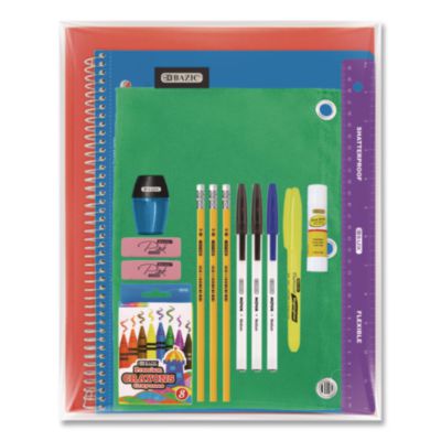 This complete set of essentials for school includes a notebook, folder, pencils, pens, highlighters, pencil pouch, ruler, glue sticks, sharpener and erasers, Durable supplies withstand daily student use—tear-resistant notebook covers, break-resistant ruler, smooth-writing pens, and reinforced pencil pouch with sturdy zipper. Contains: (1) Notebook; (1) Portfolio Folder; (1) Pencil Pouch; (1) Ruler; (3) Pencils; (3) Stick Pens; (8) Crayons; (1) Sharpener; (1) Glue Stick; (1) Highlighter; (2) Pink Erasers; Color(s): Assorted.