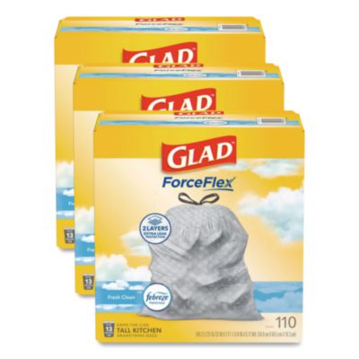 Let the stretchable strength of Glad® ForceFlex™ handle all the messes our busy daily life can throw at it and then some. Glad® Tall Kitchen Drawstring Trash Bags are designed with ForceFlex™ technology to give extra flex as it expands around sharp edges and heavy loads, so you can pack it in while resisting tears, rips and punctures. These trash bags are designed with two layers for extra leak protection. RipGuard® and LeakGuard® technology prevent seepage of liquids and keep trash contained. Fight nasty kitchen odors with the exclusive Glad trash bag combination of steady release of Febreze freshness and irresistible Fresh Clean scent that traps, locks and neutralizes odors. The durable Grips The Can Drawstring ensures a tight grip on the trash can to keep it in place. Take the trash to the curb with no fear of leaks and tears, and no frustration. Commercial/Consumer Use: Commercial Use; Maximum Volume Range: 11 to 15 gal; Maximum Volume Capacity: 13 gal; Weight Capacity (Dry): 13 gal.