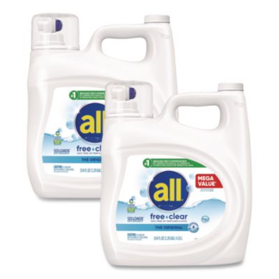 When it comes to laundry care for sensitive skin, all® free clear HE liquid laundry detergent is the obvious choice. This hypoallergenic laundry detergent is the #1 recommended detergent brand by dermatologists, allergists and pediatricians for sensitive skin and Safer Choice certified. 100% free of perfumes and dyes. Use with all® free and clear fabric softener and dryer sheets for clean and soft clothes with static cling reduction in the dryer. Great for small or large loads or for pre-treating stains before washing. Check an inseam for colorfastness. This unscented, fragrance-free detergent is safe to use in any washing machine including high efficiency (HE) and at any water temperature. 123 Loads. Application: HE Laundry Detergent; Applicable Material: Fabric; Chemical Compound: Water; C12-15 Alcohols Ethoxylated; Sodium Laureth Sulfate; Sodium Carbonate; Trisodium Dicarboxymethyl Alaninate; Fatty Acids; C8-18 and C18-Unsaturated Sodium Salts; Sodium Polyacrylate; Benzisothiazolinone; Dirt Types: Food Stains; Grass Stains; Grease; Oil-Based Soil; Organic Matter; Water-Based Soil.