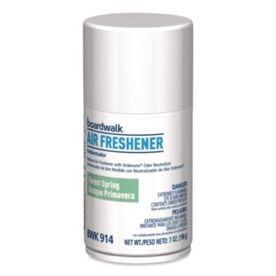 Boardwalk Metered Air Freshener Refill provide premium fragrances that create a pleasing atmosphere in any room. Each metered spray eliminates offensive odors while leaving behind a long-lasting freshness and inviting scent. Great way to discreetly freshen washrooms, trash collection areas, kitchens, lobbies and classrooms. Refill fits most standard-size metered aerosol dispensers, which are sold separately. Each refill can last 30 days in dispenser. Scent: Forest Spring; Physical Form: Aerosol; Application: Odor Control; Volume Capacity: 7 oz.