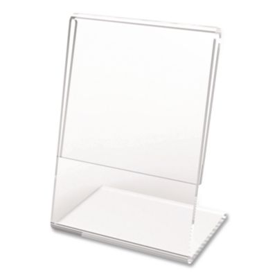 Can be displayed upright or angled to promote your message. Use this economical sign holder to display marketing information, announcements and small signs. A slant back design offers an optimal viewing angle. Made of clear plastic, this sign makes a great-looking display piece and is a terrific value. Perfect for use in retail shops, classrooms, offices and trade shows. Face Color(s): Clear; Insert Size: 3" x 4"; Orientation: Portrait; Width: 3".