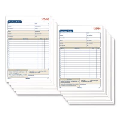 Easily keep hard copy records of each purchase order with the Adams® Multipart Purchase Order Pad. A comprehensive, preprinted layout features prompts for all the important details. With entry areas for purchaser, ship-to and administrative information as well as itemized order details, just about anything one might wish to capture can be accommodated. Carbonless, multipart format lets you provide a copy to the purchaser while keeping copies for yourself, and the pad's wraparound cover also allows you to place the front cover between sets as you fill out a form, minimizing the potential for write-through. Form Type Details: Three-Part Carbonless; Dated: No; Forms Per Page: 1; Form Size: 8.44 x 5.56.