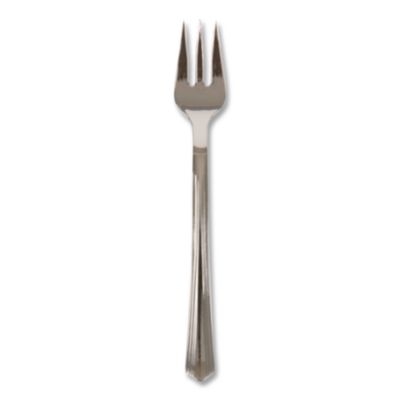 Elegantly shaped petite forks are perfect for tasting and mini-bite service. They also provide a way to control portions. Utensils Type: Petite Fork; Material Type: Plastic; Material(s): Polystyrene; Color(s): Silver.