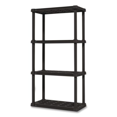 Whether in the garage or in the home, use the convenient shelving unit to store storage boxes, gardening tools, clothes, sports equipment, cleaning supplies, books or use as a plant shelf. The shelving unit is made with durable resin designed with plenty of space on each shelf to hold items whether heavy or light. The storage shelf can be assembled easily by simply interconnecting the shelves and connecting bars together without any tools. Organize your home and bring fashion and functionality with this simple sleek storage shelf that blends in wherever it is placed. Number of Shelves: 4; Shelf Capacity (Weight): 40 lb; Material(s): Polypropylene; Color(s): Black.