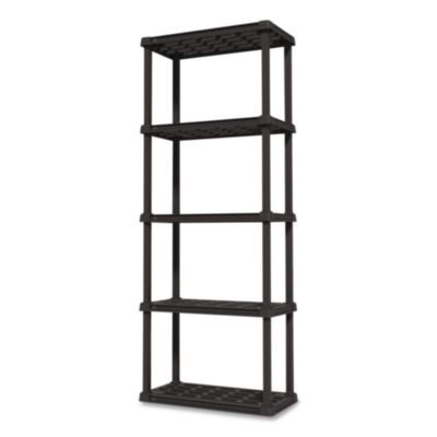 Whether in the garage or in the home, use the convenient shelving unit to store storage boxes, gardening tools, clothes, sports equipment, cleaning supplies, books or use as a plant shelf. The shelving unit is made with durable resin designed with plenty of space on each shelf to hold items whether heavy or light. The storage shelf can be assembled easily by simply interconnecting the shelves and connecting bars together without any tools. Organize your home and bring fashion and functionality with this simple sleek storage shelf that blends in wherever it is placed. Number of Shelves: 5; Shelf Capacity (Weight): 40 lb; Material(s): Polypropylene; Color(s): Black.