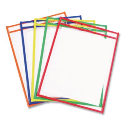 Reusable Dry Erase Pockets, Super Heavy-Duty, Top Load 9 x 12 Insert, Clear Front, Assorted Border Colors, 5/Pack