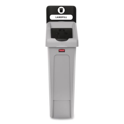 Kit offers an adaptable recycling solution to fit any commercial facility's recycling needs. The station features color-coded lids and billboards, stream-specific openings, labeling with intuitive icons and verbiage to help patrons and staff sort recyclables with ease. Each stream station connects without the use of hardware or tools for easy assembly. The durable connector snaps into place, securely holding the containers together. The containers feature bag cinches, eliminating the need to tie knots to secure liners and venting channels, making it easier to remove full liners. The sleek design fits seamlessly into front-of-house spaces like lobbies and breakrooms. 1-Stream-Landfill. Waste Receptacle Type: Indoor Recyling Bin; Material(s): Plastic; Application: Indoor Recycling; Interior Volume Capacity: 23 gal.