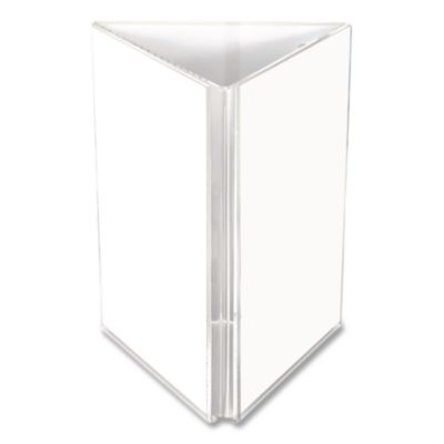 Made of clear acrylic, this three-sided countertop sign holder is perfect for displaying advertising, graphic images, printed media or to showcase documents that you would like to have on display in your retail shop, restaurant, or office. This multiple-sided table frame is ideal to inform your customers or clients about hours of operation, today's specials, upcoming sales, advertisements, or general informational notices. Face Color(s): Clear; Insert Size: 4" x 6"; Material(s): Acrylic; Orientation: Portrait.