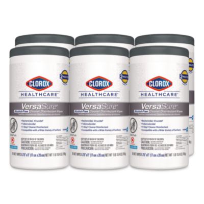 Clorox Healthcare® VersaSure Cleaner™ Disinfectant Wipes kill over 40 pathogens quickly on a broad range of surfaces. These strong and durable clothlike wipes are your alcohol-free solution to cleaning and disinfecting. VersaSure wipes are EPA registered to kill pathogens on hard surfaces in as fast as 30 seconds for most bacteria and viruses, including mumps, measles, MRSA and tuberculosis. These one step disinfecting wipes meet EPA efficacy testing requirements for hospital disinfection, making them great for daily use in your healthcare facility. Designed for patient and staff comfort, the alcohol free quat formula is made with no harsh chemical odors, fumes or added fragrances. The nonwoven wipe does not leave lint on surfaces, and the larger wipe covers more surface area with less effort. Intended for use in healthcare settings. Towel/Wipe Type: Cleaning/Disinfecting Wipes; Applicable Material: Aluminum; Baked Enamel; Brass; Chrome; Copper; Corian; Finished Wood; Formica; Galvanized Steel; Glass; Glazed Porcelain; Laminate; Linoleum; Marble; Metal; Naugahyde; Painted Metal; Painted Wood; Plastic; Plastic Laminate; Plexiglass; Porcelain Enamel; Rubber; Sealed Fiberglass; Sealed Granite; Sealed Wood; Silver; Stainless Steel; Synthetic Marble; Treated Wood; Vinyl Tile; Wood; Material(s): Nonwoven Fiber; Chemical Compound: Ethanolamine; Quaternary Ammonium Compounds, C12-14-Alkyl[(Ethylphenyl )Methyl]Dimethyl, Chlorides; Quaternary Ammonium Compounds, C12-18-Alkyl[(Ethylphenyl )Methyl]Dimethyl, Chlorides.