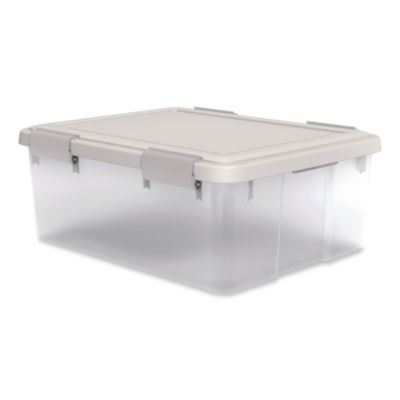 Equip your warehouse and storeroom with this WeatherPro stackable storage bin. The transparent finish offers clear visibility for easy access, while the reinforced lid safeguards the contents from dirt and liquid. Use the snap-on latches to keep the cover tightly secure. This WeatherPro stackable storage bin features sturdy plastic for long-lasting durability even when stacked with other bins. Number of Compartments: 1; Capacity (Volume): 30.6 qt; Material(s): Plastic; Material Family: Plastic.